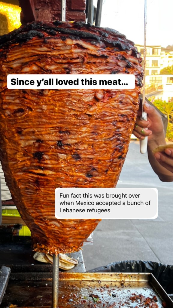 Did you know al pastor actually comes from the Middle East? Yes, al pastor is inspired by shawarma! Lebanese immigrants moved to Mexico in the early 1900s and they brought their spit-roasted meat with them.